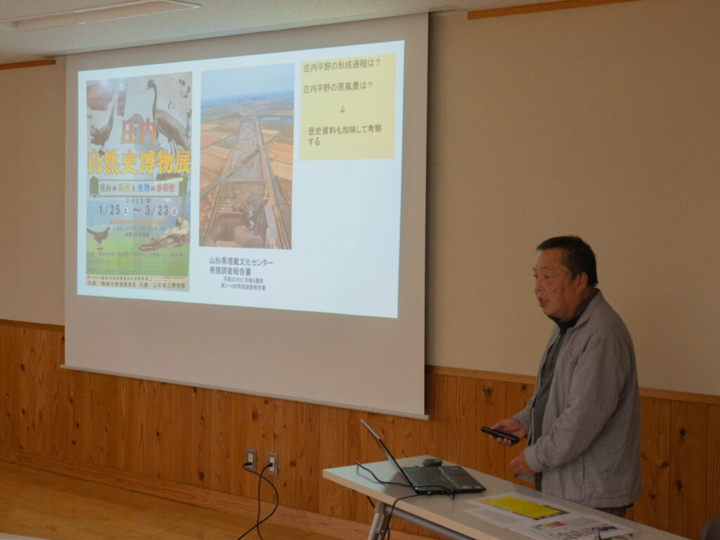 講師を務められた富樫均先生は新潟大学で地質学を専攻され、鶴岡市立大山小学校の校長を務めた後、鶴岡市自然学習交流館ほとりあの館長を9年間歴任されている地質学の専門家です。太古の海から現在の美田へと続く壮大な時間の流れを実感できる貴重な講座でした。